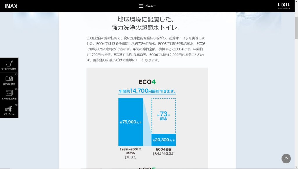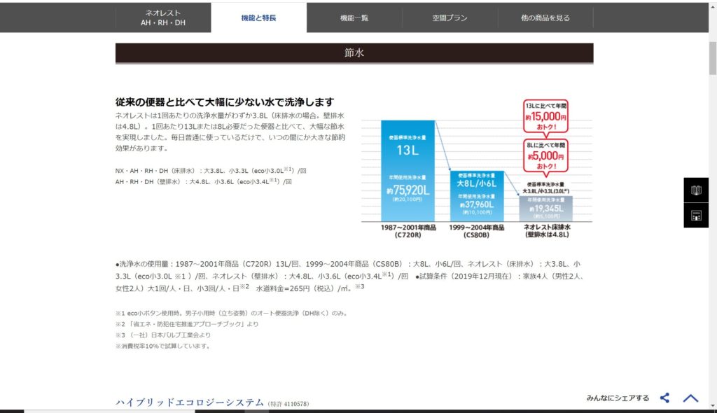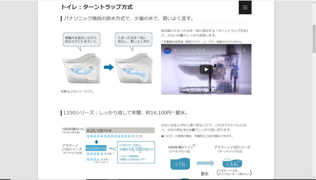 各社それぞれが技術の向上により、少ない水量でしっかり流すことを可能にしています。