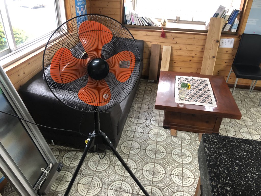 業務用扇風機を回して敵の行動範囲を狭め、ハエがよく止まる個所にも小型の扇風機を設置。