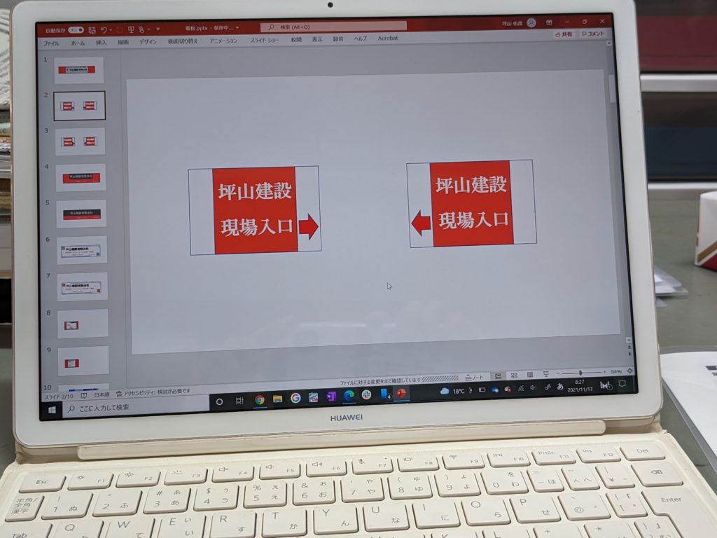 古くなった現場入口の看板を新しくしよう。という話になり、さっそくデザインから考えていきました。